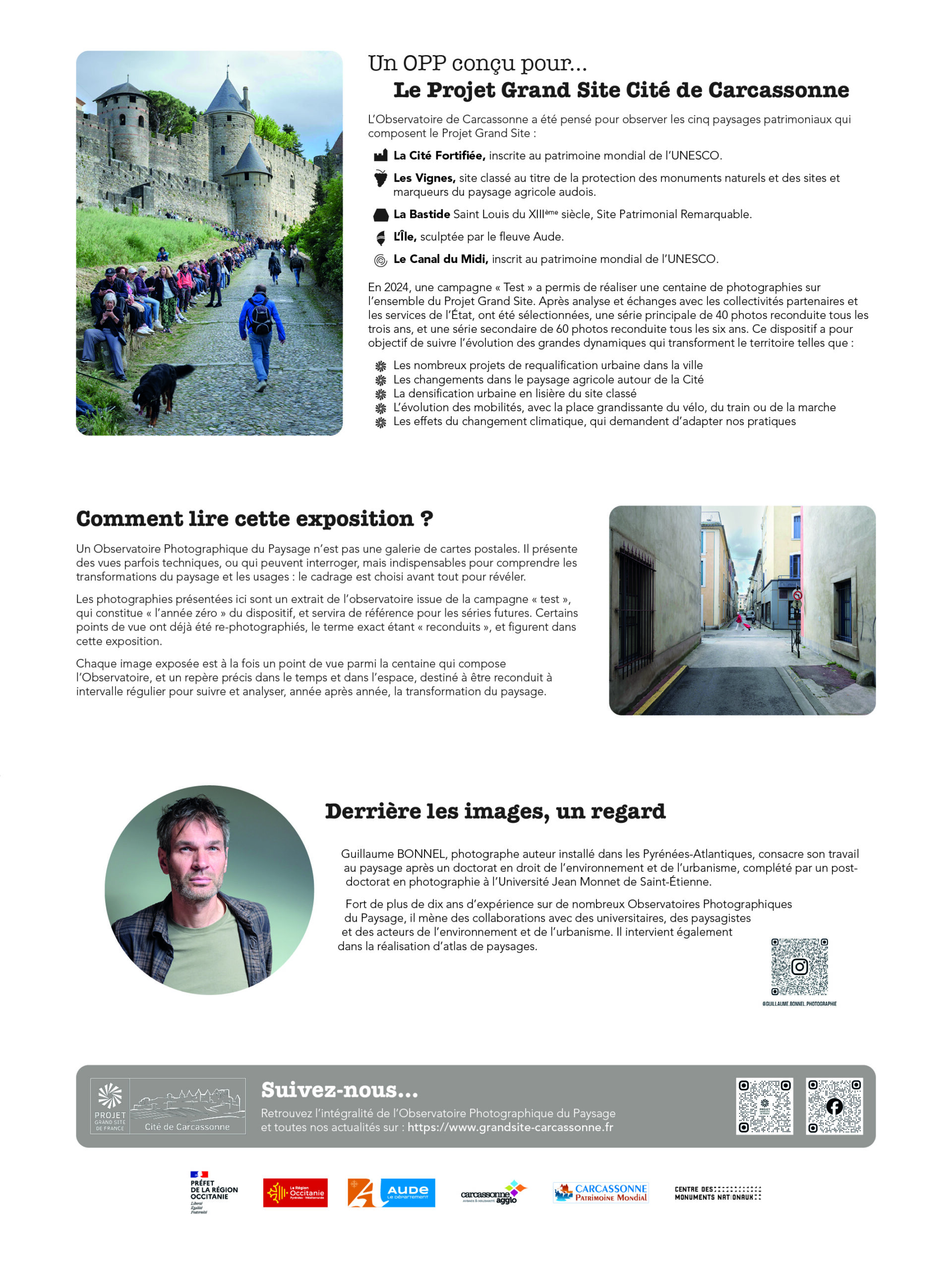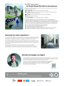 Les photographies, présentées en trois formats pour varier le rythme et donner du relief, mettent en lumière les cinq paysages patrimoniaux du Projet Grand Site : la Cité fortifiée, la Bastide, l’Île, les Vignes, et le canal du Midi.